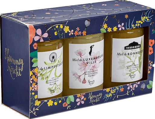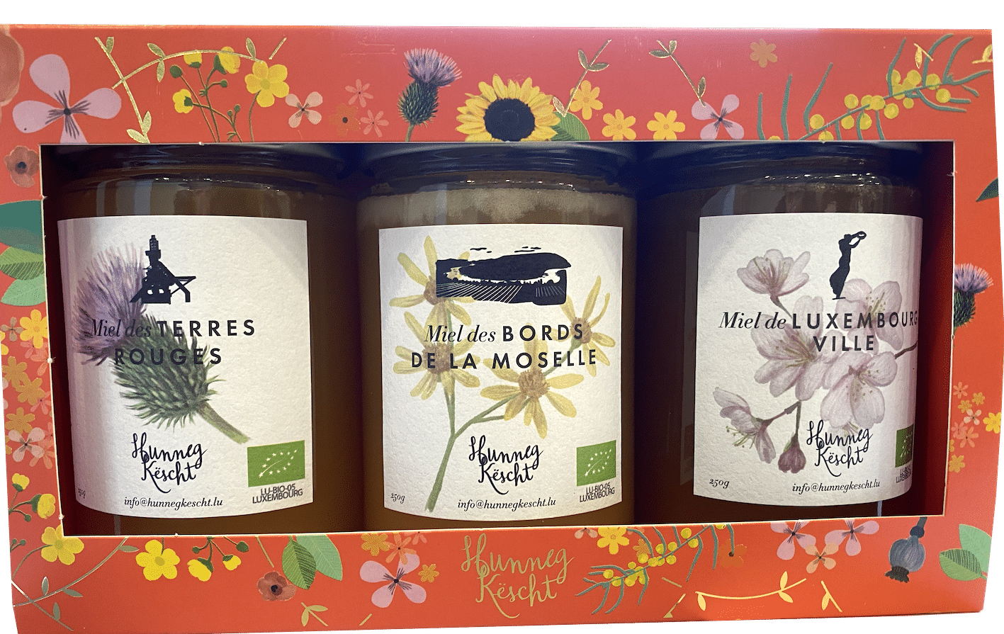 Ces miels proviennent des fleurs de votre quartier et de vos régions. Ils sont issus d’une apiculture raisonnée et respectueuse des abeilles. Les ruchers urbains n’excèdent pas 8 ruches. Ce miel labelisé bio est filtré à son extraction et mis en pot par l’apiculteur à Luxembourg ville.